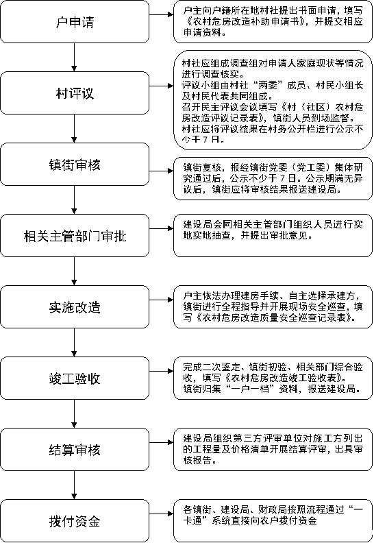 农村危房改造补助严格实行户申请、村评议、镇街审核、相关主管部门审批程序: